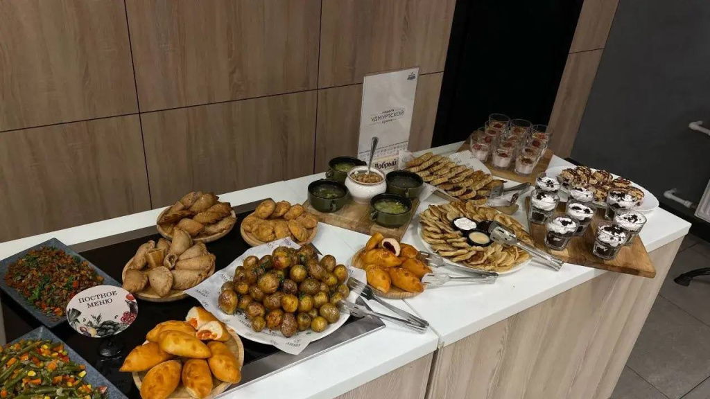На шведском столе гости смогут попробовать блюда национальной кухни: ароматную выпечку, сытные горячие блюда и другие угощения, которые передают атмосферу удмуртского гостеприимства.